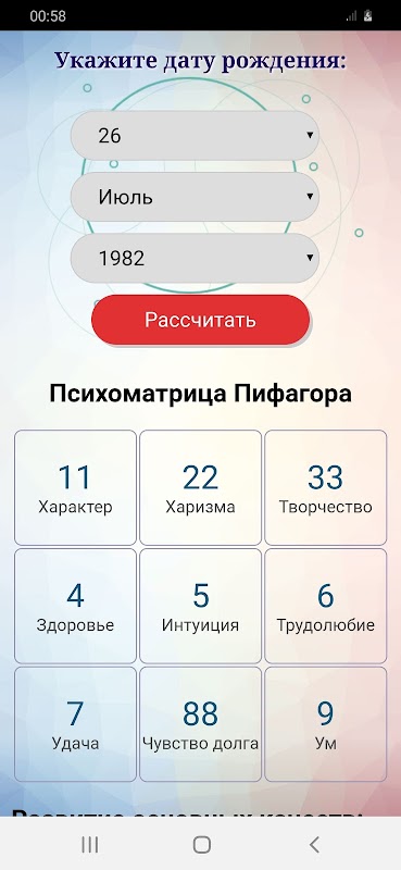 "Pythagoras Square", ou em outras palavras "Pythagoras Psychomatrix", ajudará a calcular traços de caráter e talentos ocultos por data de nascimento.