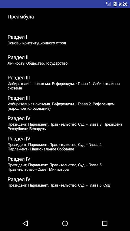 2) Два варианта отображении конституции: сплошным текстом и по разделам.