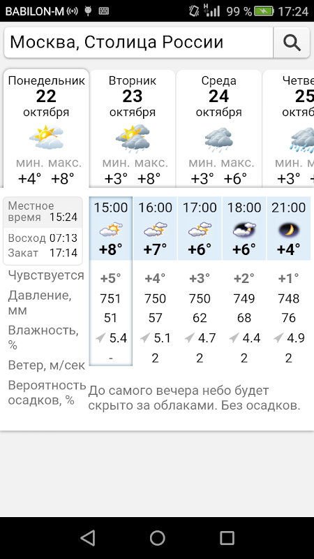 Мониторинг погоды механически определяет погоду в вашем текущем местоположении. В мониторинге погоды есть большое количество инфы, которая подключает в себя погодные обстоятельства, атмосферное нажим, условную влажность, расстояние видимости, численность осадков в различных объединениях, точку росы, скорость и назначение ветра, а еще мониторинг на 10 дней вперед, а еще ежечасный мониторинг погоды.