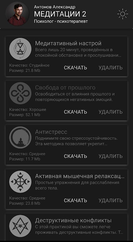 A segunda edição do programa de meditação de Alexander Antonov, psicólogo-psicoterapeuta. Novas gravações irão abrir para você quatro técnicas: melhoria do humor, um lugar de poder, amor próprio e relaxamento profundo. Eles são definidos por padrão.