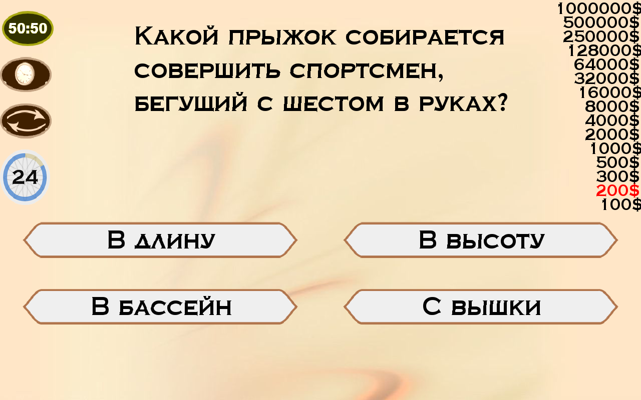 Обратите внимание, что в отличии от других игр "Миллионером?" у нас вы можете играть абсолютно бесплатно независимо от успехов в игре. Количество вопросов превышает пять тысяч и уверенно стремится к десяти.