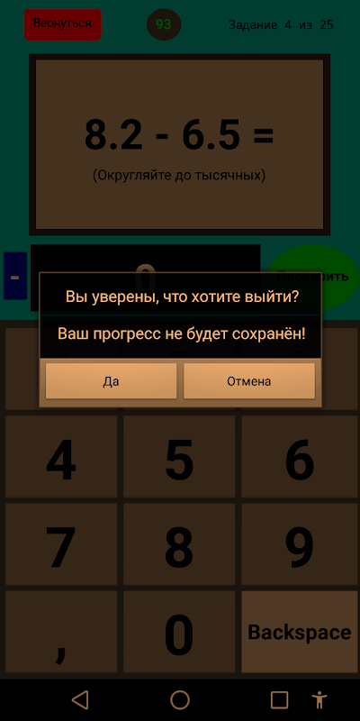 Você receberá exemplos, cujas respostas você deve dar em 100 segundos. Você pode resolver problemas de adição, subtração, multiplicação, divisão e quadratura. Em atualizações futuras, funções como encontrar a raiz e a potência de 2 podem ser adicionadas.