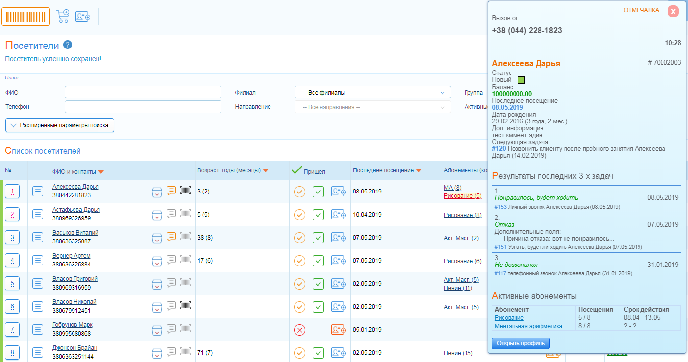 • Быстрого перехода на страницу создания нового клиента (посетителя или лида) из всплывающей карточки.