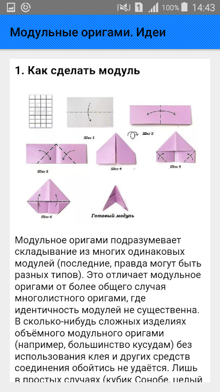 Origami é uma arte oriental ao usar papel para criar artesanato atraente. O origami modular é uma das variedades da técnica comum de origami, que aparece como uma combinação de várias partes idênticas. Origami chinês modular (ou 3D Origami) - a criação de figuras tridimensionais a partir dos módulos triangulares de origami inventados na China. A figura inteira é montada a partir de muitas peças idênticas (módulos). Cada módulo é dobrado de acordo com as regras do origami clássico de uma folha de papel e, em seguida, os módulos são conectados, aninhando-os. Às vezes, cola é adicionada para dar força.
