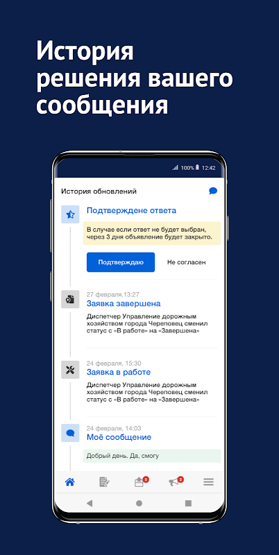 Envie mensagens de acordo com os tipos de problemas disponíveis. Seu recurso irá automaticamente para a organização certa. Você pode monitorar o andamento do trabalho em sua mensagem, monitorar a mudança de status. Havendo dúvidas de esclarecimento, é realizado um chat entre o usuário (residente) e o despachante da organização responsável por eliminar este problema. Após a conclusão da obra, você pode avaliar a qualidade do serviço prestado ou rejeitar a decisão se não ficar satisfeito com a decisão tomada pelo contratante.