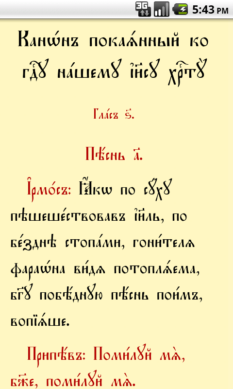 Você pode definir o idioma - leia em russo ou eslavo eclesiástico. Observe que em eslavo eclesiástico o conjunto de orações é muito menor do que em russo!