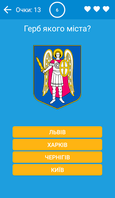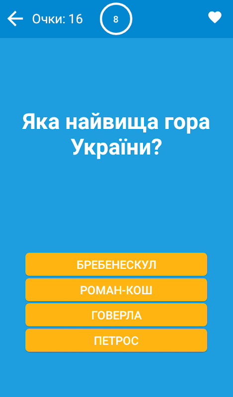 На кожне питання дається 10 секунд і 4 варіанти відповіді. Відповісти неправильно можна тільки 3 рази за гру. Встановлюйте рекорди та змагайтеся з друзями! Приємної гри!