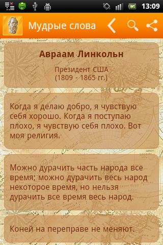 Учиться на чужих ошибках и советах всегда непросто, но если уж прислушиваться к кому-то, так лучше к великим, успешным людям, сумевшим многого добиться своим умом. Приложение включает в себя подборку фраз известных писателей, актеров, музыкантов и политиков, мудрость которых заслуживает внимания.