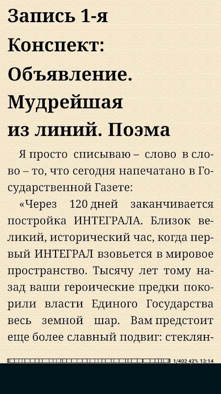 «Через 120 дней заканчивается постройка ИНТЕГРАЛА. Близок великий, исторический час, когда первый ИНТЕГРАЛ взовьется в мировое пространство. Тысячу лет тому назад ваши героические предки покорили власти Единого Государства весь земной шар.