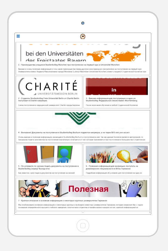 Вы планируете поступать в ВУЗы Германии или уже учитесь в этой стране? Или, быть может, Вы хотите пройти интенсивную языковую подготовку перед поступлением в немецкие высшие учебные заведения? Приложение нашего Общества русскоязычных студентов Германии, насчитывающего уже более 1.000 студентов из стран СНГ, поможет Вам в реализации поставленных Вами целей в рамках переезда в ФРГ с целью обучения. В независимости от того, к какой категории соискателей Вы относитесь, данное приложение станет Вашим первым помощником и советчиком. Помимо постоянно актуализирующихся новостей из области обучения в Германии, Вы сможете получить от нас огромное количество советов и рекомендаций по таким тематикам как:
