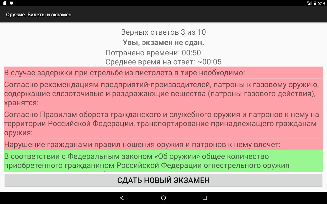 Также есть режим "Экзамен", в котором выбираются 10 вопросов случайным образом, после сдачи которого можно проделать работу над ошибками.