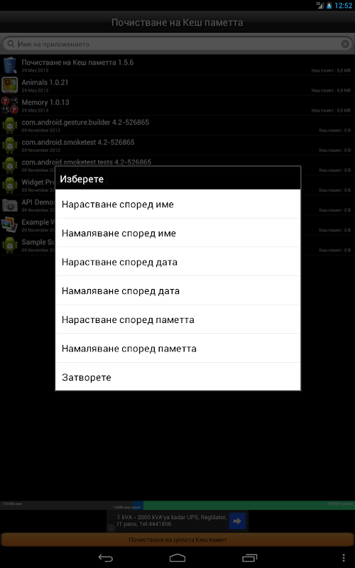 - Показване размера на всички приложения от списъка, които заемат място в Кеш паметта