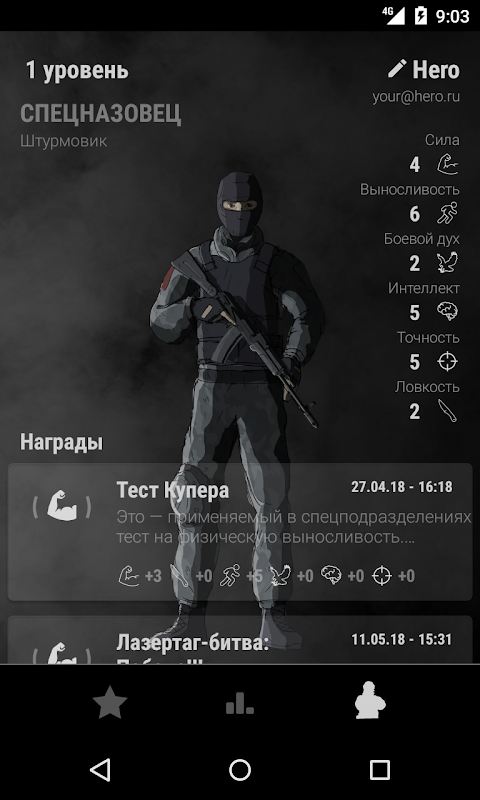 ИГРЫ КОНЧИЛИСЬ! "Прокачай своего героя" - это мир, где игровым персонажем будешь ты сам. Это виртуальная образовательно-игровая платформа для геймофикации реальной жизни. Она работает в тандеме с реальными уроками и занятиями, и представляет собой смесь ролевой игры и фитнес-тренера. Так же, как это бывает в играх – здесь есть бонусы за каждое выполненное задание, игровая форма, опыт, уровни при развитии своего персонажа, овладение массой новых знаний и навыков. Но получить всё это в мобильной игре ты сможет только если участник в реальной жизни выполнишь ряд условий. Например, научившись отжиматься 30 раз, ты получишь +5 очков силы, а сдав тест по истории обороны Москвы + 10 к интеллекту. Прокачивай своего героя и самого себя и получай доступ к новым миссиям - игра в лазертаг и страйкбол, прыжки с парашютной вышки и штурмовой альпинизм. Но не на экране, а в реальности. Тебя ждут занятия по специальной, теоретической, практической, строевой, стрелковой подготовке, ролевые игры, полевые выходы, поездки в воинскую часть. Дойди до конца и ты будешь знать все, что нужно для успешного прохождения службы.