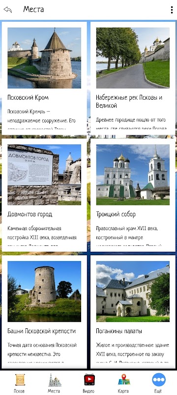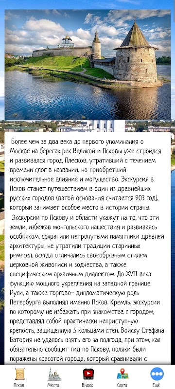 Neste aplicativo, você pode fazer um primeiro contato com Pskov, escolher um lugar para viajar olhando os pontos turísticos e as avaliações de vídeo. O aplicativo também contém informações sobre agências de turismo e hotéis que oferecem seus serviços na cidade selecionada.