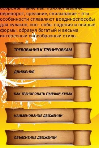 técnica Drunken Punho estilo. Em termos de equipamento militar de formulário bêbado movimentos valiosos para confundir o inimigo. estilo Drunken - é a imprevisibilidade de circulação, liberdade de movimento! Através da aplicação você tem: