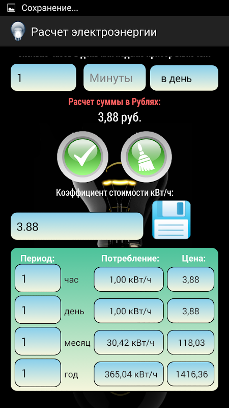 Para realizar o cálculo, você deve especificar a potência do dispositivo (em watts (W), a duração do uso em horas ou minutos e o coeficiente.