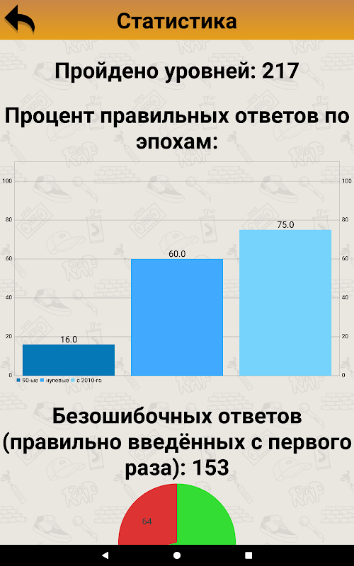 А ещё в игре есть статистика и достижения! Оцените свои познания в русском рэпе! На сколько вопросов Вы ответили без подсказок? Как хорошо Вы знаете рэп-альбомы? В рэп-культуре какого десятилетия Вы разбираетесь лучше всего? Узнайте ответы на все эти вопросы, преодолев долгую и увлекательную дорогу от популярных рэп-исполнителей до представителей андеграунд-сцены!