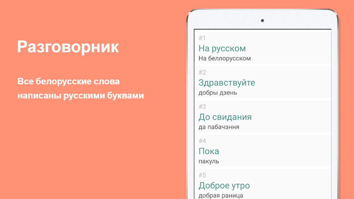 O livro de frases russo-bielorrusso pode ser usado, respectivamente, como um livro de frases e uma ferramenta para aprender a língua bielorrussa. Todas as palavras bielorrussas são escritas em letras russas e divididas em 15 tópicos lógicos, ou seja, o livro de frases é projetado para um usuário (turista) que fala russo.