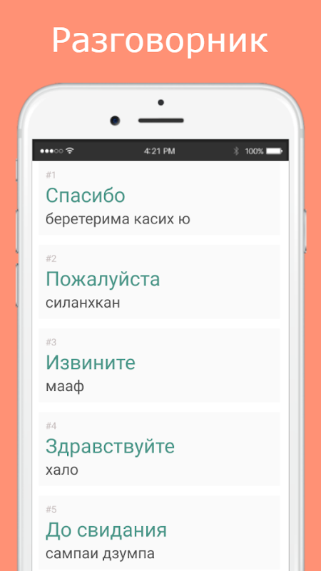 Русско-индонезийский разговорник можно использовать соответственно, как разговорник, так и инструмент для изучения индонезийского языка. Все индонезийские слова написаны русскими буквами и разбиты на 6 логических тем, то есть разговорник рассчитан на русскоговорящего пользователя (туриста).