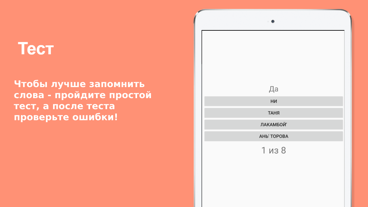 После прохождения теста по выбранной теме, можно просматривать ошибки. Также, результат прохождения теста по каждой из тем сохраняется, ваша цель - выучить все слова в выбранной теме на 100%.