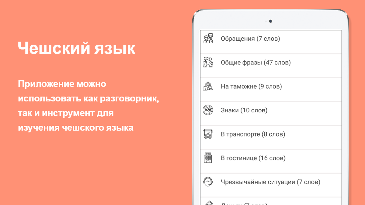 O livro de frases Russo-Tcheco pode ser usado, respectivamente, como um livro de frases e como uma ferramenta para aprender a língua tcheca. Todas as palavras em tcheco são escritas em letras russas e divididas em 12 tópicos lógicos, ou seja, o livro de frases é projetado para um usuário (turista) que fala russo.