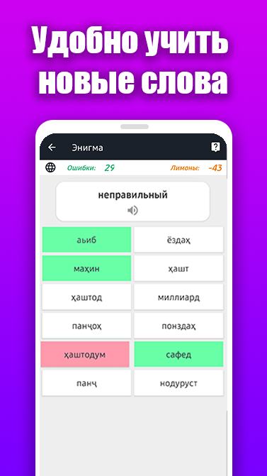 Aprenda novas palavras em russo com Salom! Russo (em tadjique) é muito conveniente! A aplicação é completamente em tadjique!