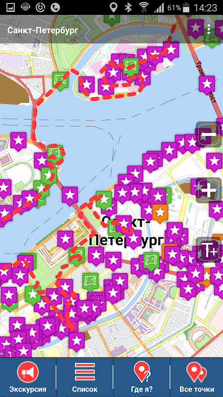 ● PASSEIOS POR SÃO PETERSBURGO. Nem todos os lugares interessantes que valem a pena visitar na Capital do Norte podem ser incluídos em rotas de excursão. Crie seu próprio passeio a pé por São Petersburgo simplesmente selecionando os locais desejados no catálogo, e eles aparecerão imediatamente no mapa. Você pode ocultar temporariamente outros objetos do mapa.