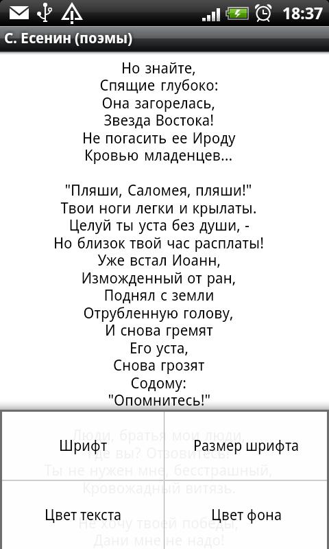 Программа представляет собой сборник поэм Сергея Есенина, в который вошли 42 поэмы, среди которых: Пугачев, Анна Снегина, Песнь о великом походе, Поэма о 36, Страна негодяев, Черный человек, Микола, Русь. Отличительные черты приложения: удобная и быстрая навигация, возможность адаптирования настроек предпочтениям читателя (возможность выбирать шрифт, его размер и цвет, а также цвет фона).