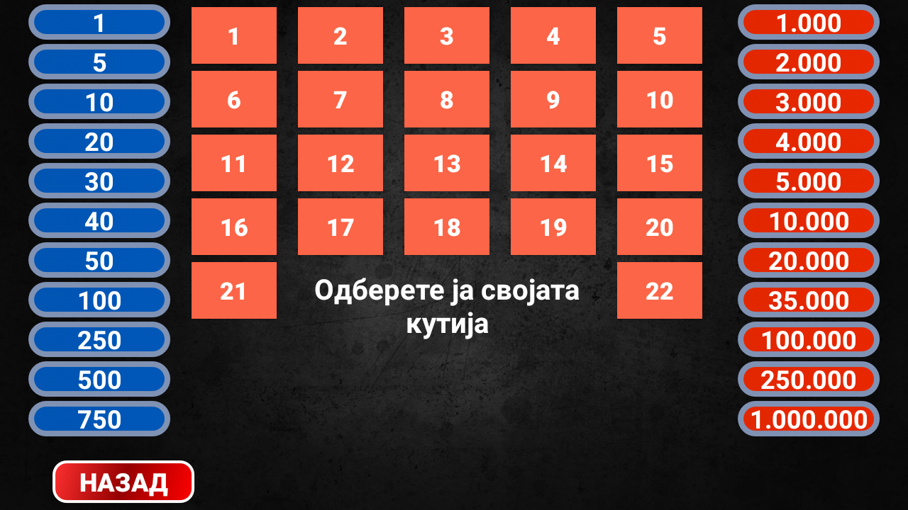 Вкупно има 22 кутии. Во првата рунда се отвараат 5 кутии па потоа по 3 кутии се додека не останат вашата кутија и уште една. После секоја рунда добивате понуда од банкарот која може да ја прифатите или одбиете.