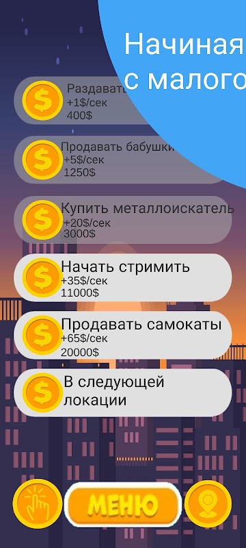 Neste emocionante jogo você deve se tornar o homem mais rico do mundo. Com suas ideias de negócios, você pode conquistar o mundo inteiro, começando pela sua pequena cidade, e eventualmente chegará a Marte! Ao clicar no botão, comprar upgrades passivos e upgrades no clique, obtendo conquistas, você alcançará seu objetivo estimado.