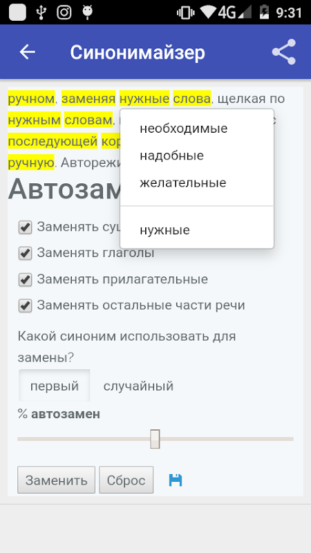 O editor de texto Sinonyimizer com correção para textos russos permite que você encontre sinônimos para palavras no texto sem perder o significado. Isso pode ser usado para realçar a singularidade dos textos.