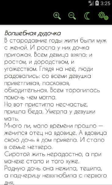 После прочтения, сказки автоматически отмечаются прочитанными, можно фильтровать сказки в списке и отображать "Все", только "Прочитанные" или "Непрочитанные" статьи.Есть возможность найти сказку по заголовку, настроить фон и шрифт текста.
