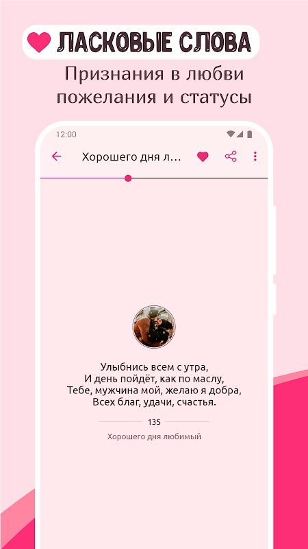 O aplicativo de amor contém uma grande variedade de categorias de declarações de amor sms que não deixarão indiferente sua alma gêmea forte: Frases agradáveis para namoro. Palavras bonitas. Elogios agradáveis sem a Internet. Desejos de bom dia, bom apetite, bom dia e boa noite. Eu sinto sua falta querida e estou esperando por você. Fique bem logo. Desculpas - perdoe-me querida, perdoe-me por favor.