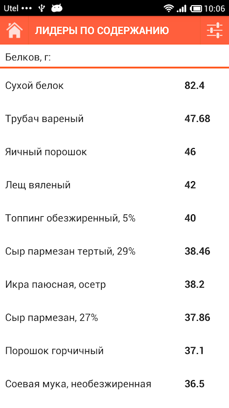 • Можно сортировать продукты по содержанию в них выбранного нутриента;