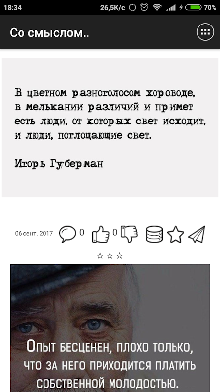 Вас интересуют приложения, в которых вы можете прочитать цитаты или факты, которые заставляют задуматься? Вам крупно повезло! "Со смыслом" - то, что вам надо! Удобный интерфейс - ничего лишнего. Здесь находится огромное количество интересных фактов, цитаты великих людей и просто цитаты, разных мыслей и истинных ситуаций. Наша коллекция интересных фактов, историй, мыслей и т.д. обновляется ежедневно. Так что заходи и начинай развиваться.😉