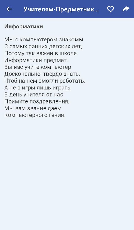 В этом приложении собраны стихи, посвященные учителям. Их можно выучить и использовать для оформления к Дню знаний, к Дню Учителя, к выпускному - любому празднику, где нужны поздравления и слова благодарности учителям!