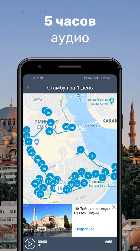 Guia de áudio off-line conveniente em Istambul e 10-30 vezes mais barato do que passeios ao vivo.