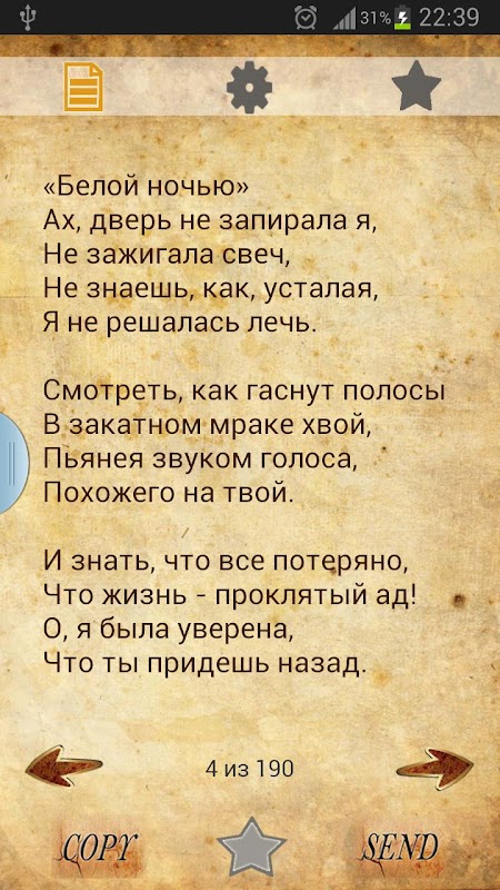 Приложение запоминает текущее стихотворение и вам не придется начинать все сначала.