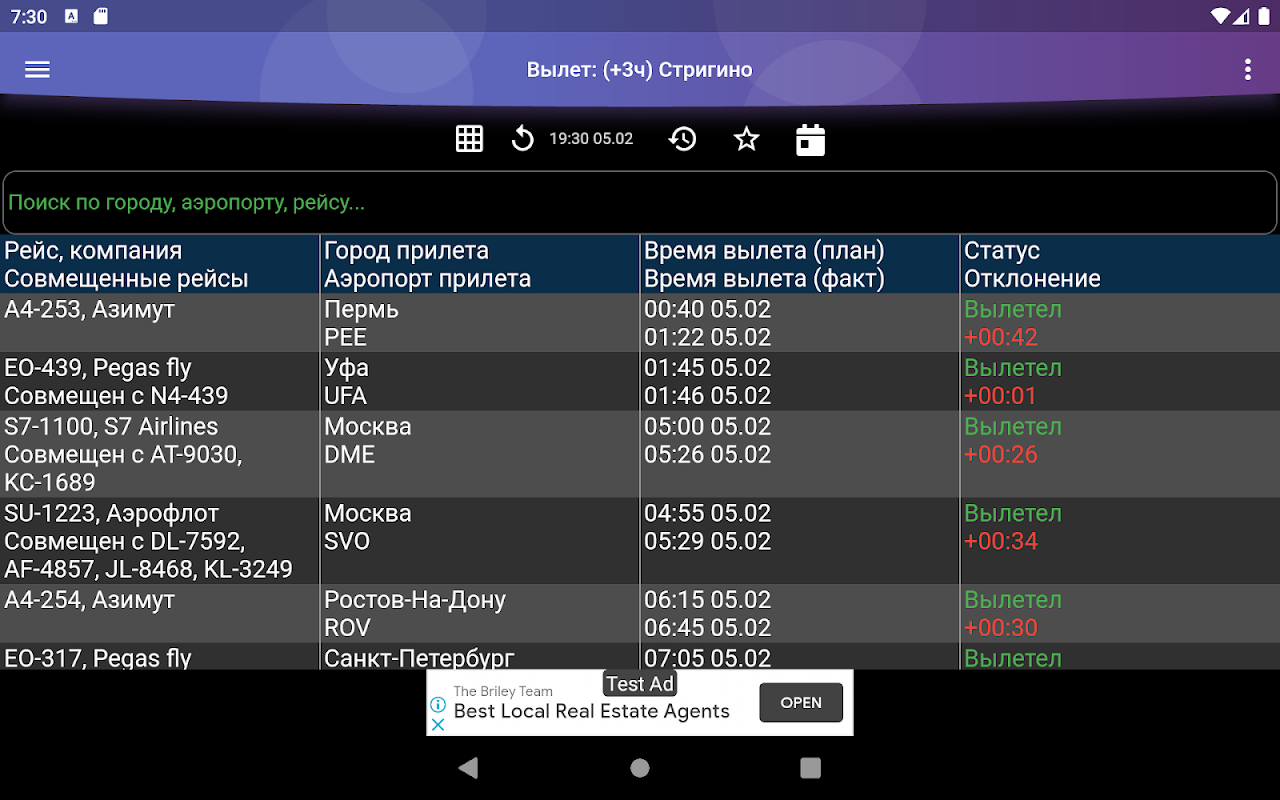 Um aplicativo não oficial que fornece informações sobre o status das partidas e chegadas de aeronaves no Aeroporto Strigino (Nizhny Novgorod). Bem como horários de voos e outras informações úteis. É possível expandir a linha do placar em uma tela de informações estendida.
