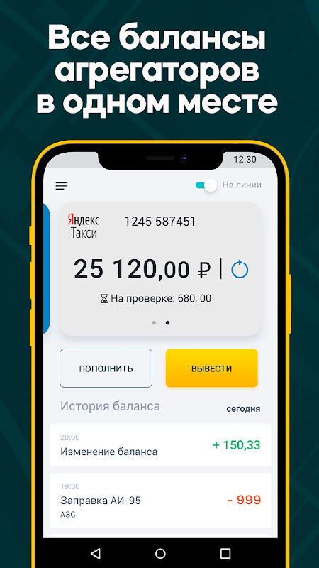 Gerencie a receita do aplicativo, retire dinheiro para o cartão a qualquer hora do dia.