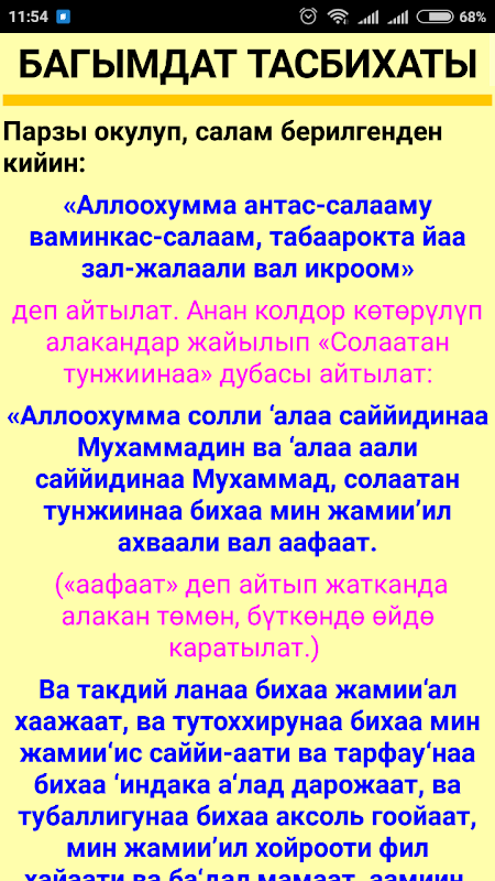 Бул программада намазда окулуучу дуалар, тасбих тартуу жана электрондук эсептегичтер камтылган. Көзгө ыңгайлуу болушу үчүн сары түстөгү фон. Эгерде программа жаккан болсо анда балл бергенди унутпаңыздар. Чоң рахмат колдонгонуңуздар үчүн.