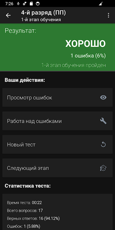 - Modo “Treinamento”, que permite estudar passo a passo todas as questões da categoria selecionada