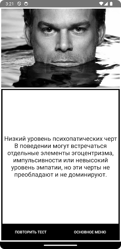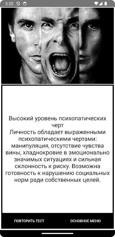 - **Teste de 12 perguntas**: responda perguntas cuidadosamente selecionadas que ajudarão a identificar os principais traços psicopáticos de sua personalidade. Cada pergunta visa analisar certos aspectos do seu comportamento e pensamento.