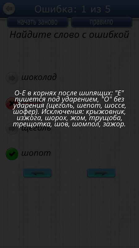 После окончанию каждого теста, вы увидите все совершённые ошибки. Заучивая правильное написание слов. После нескольких таких решений: написание русских слов, расставления ударений и окончаний, правильное написание слов самостоятельно доводится до автоматизма.