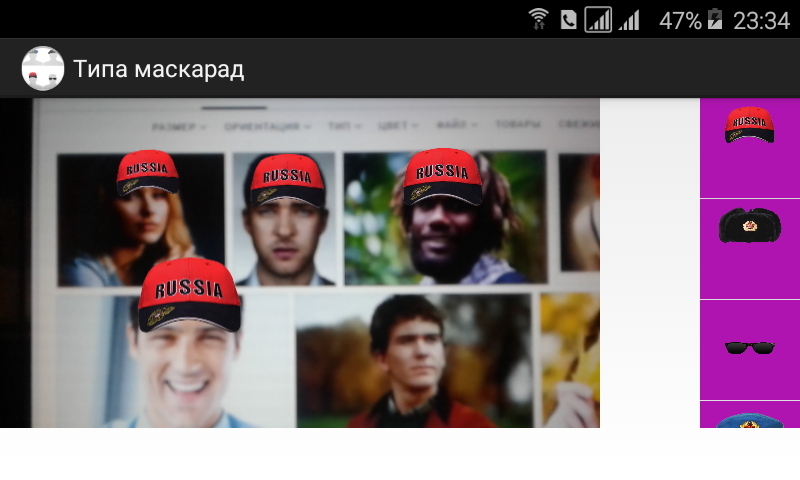 Типа маскарад - приложение нахождения лиц в реальном видеопотоке с наложением масок(береты, шапки, кепки и т.д.).