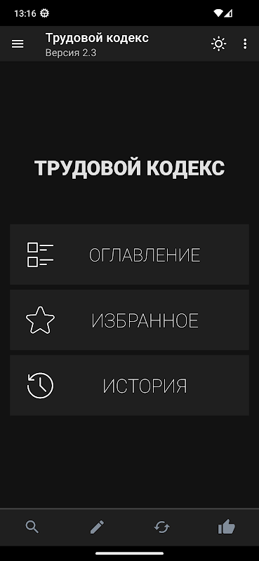 - Visualização do texto da lei na forma de conveniente virada de página de artigos, capacidade de copiar o fragmento selecionado, pesquisa por texto