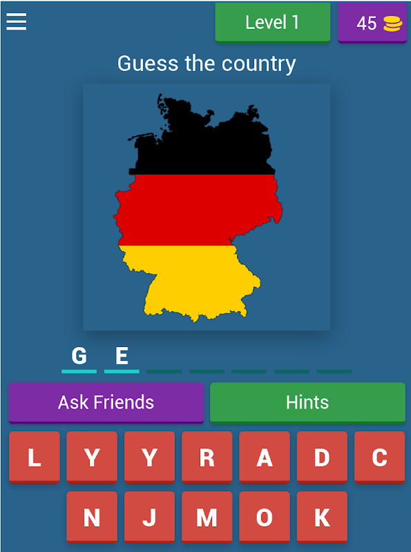 50 níveis diferentes, cada um dos quais é um enigma - uma silhueta de um país em um mapa. De poderes reconhecíveis aos cantos mais inusitados do planeta.