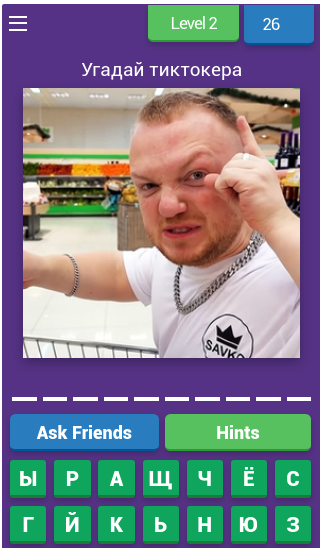 Увлекательное приложение Угадай тиктокера - отличный способ провести свободную минуту в любом месте: в транспорте, в очереди или сидя за столиком в кафе. Игра построена по принципу шоу Поле Чудес и подразумевает отгадывание слов - имён известных писателей. К услугам пользователя подсказки, кнопка Помощь Друзей и деньги, используя которые можно показать одну из букв или перейти на следующий уровень.