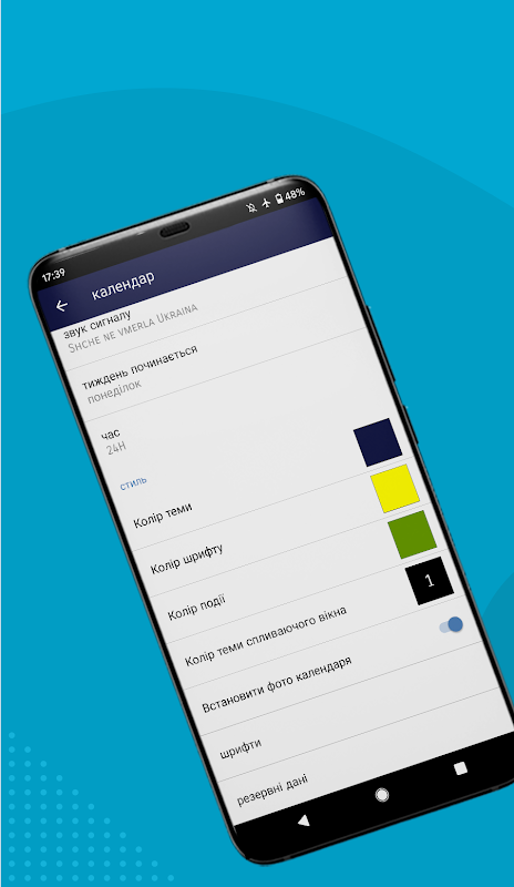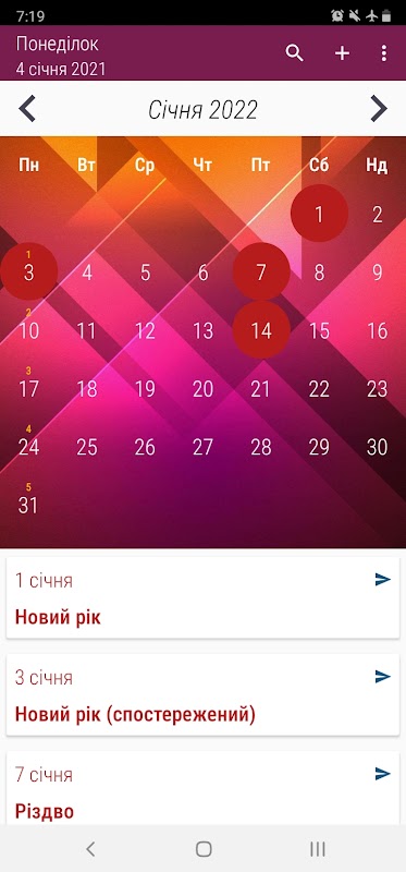 Neste calendário de feriados da Ucrânia, são indicados feriados e datas memoráveis da Ucrânia. Há uma função de numeração de semana, um widget e suporte de sinal. Após ligar o sinal, será tocado o Hino Nacional da Ucrânia "A Ucrânia ainda não morreu". Você também pode definir qualquer toque para o alarme do calendário.