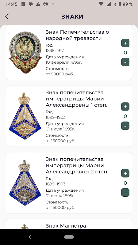 A aplicação móvel Faleristics é um catálogo de medalhas, ordens, insígnias de distinção, insígnias, etc. de diferentes períodos de tempo de Paulo I ao período soviético. Para cada prêmio, é indicado o máximo de informações possíveis, bem como o número de catálogos conhecidos de Bitkin V.V., Dyakov M.E., Smirnov V.P. A aplicação implementa uma pesquisa pelo nome do prémio, o que simplifica a procura de um prémio neste catálogo.As fotos dos prémios são apresentadas em boa qualidade com possibilidade de aumentar. Em nosso aplicativo você poderá fazer premiações de sua coleção.
